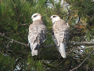 After having such a good time watching a White-Tailed Kite eat its lunch here last week, I decided to return for a repeat performance. It was even better this time, although the light was not quite as good so it was tougher to get crisp photos. The youngters were out of the nest and about, at least 3 or 4 of them. They can be told from the adults as they have brown around their necks, where the adults have white. They are about the size of the adults, but not yet hunting. An adult will return with a rodent typically a vole) in its talons. A youngster will fly up to meet the parent, who then makes a midair rodent transfer - very cool. After one such transfer, the juvenile with the rodent joined two siblings in a tree and had breakfast. A good outing!